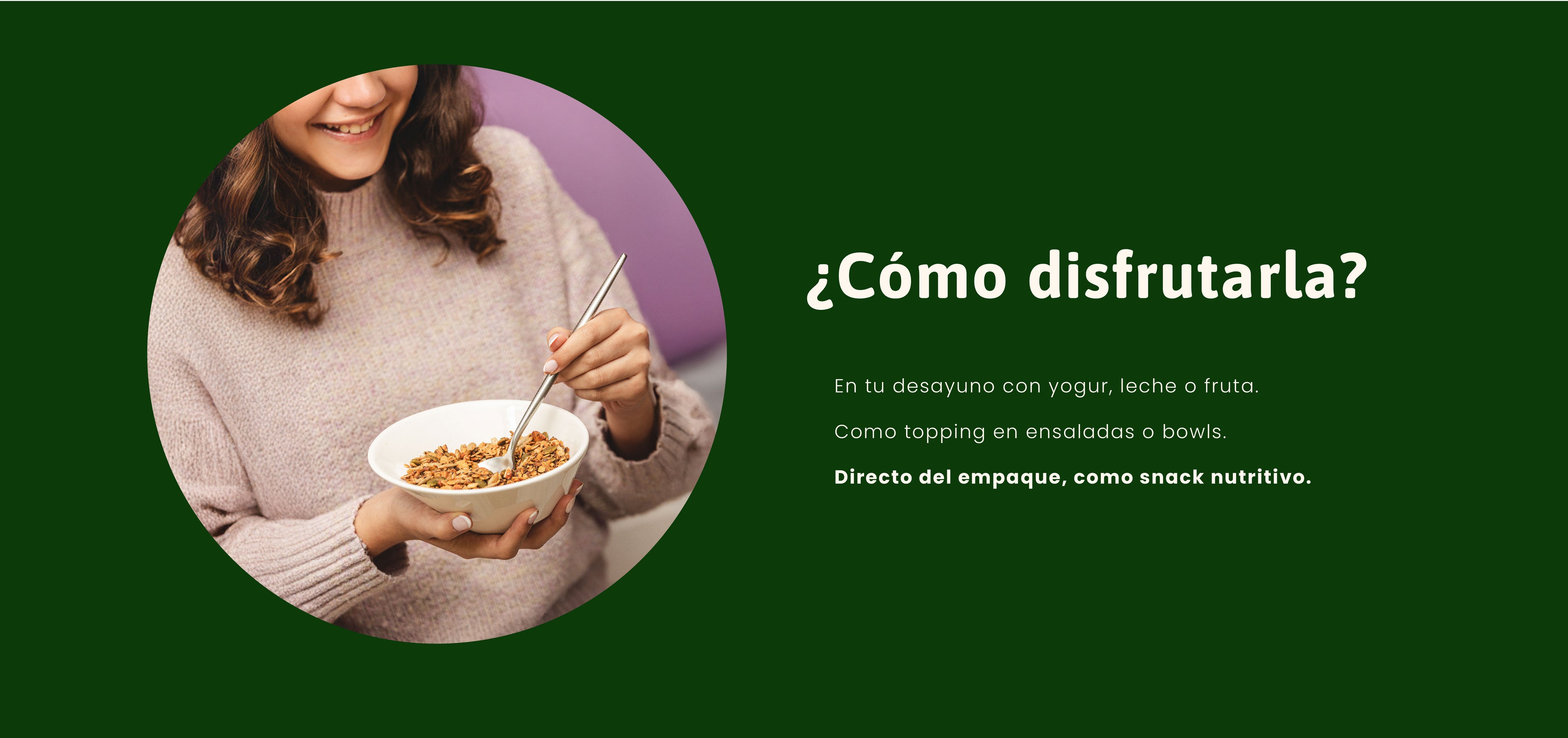 Una granola con propósito: deliciosa, crujiente y consciente — hecha para quienes eligen sentirse bien todos los días.